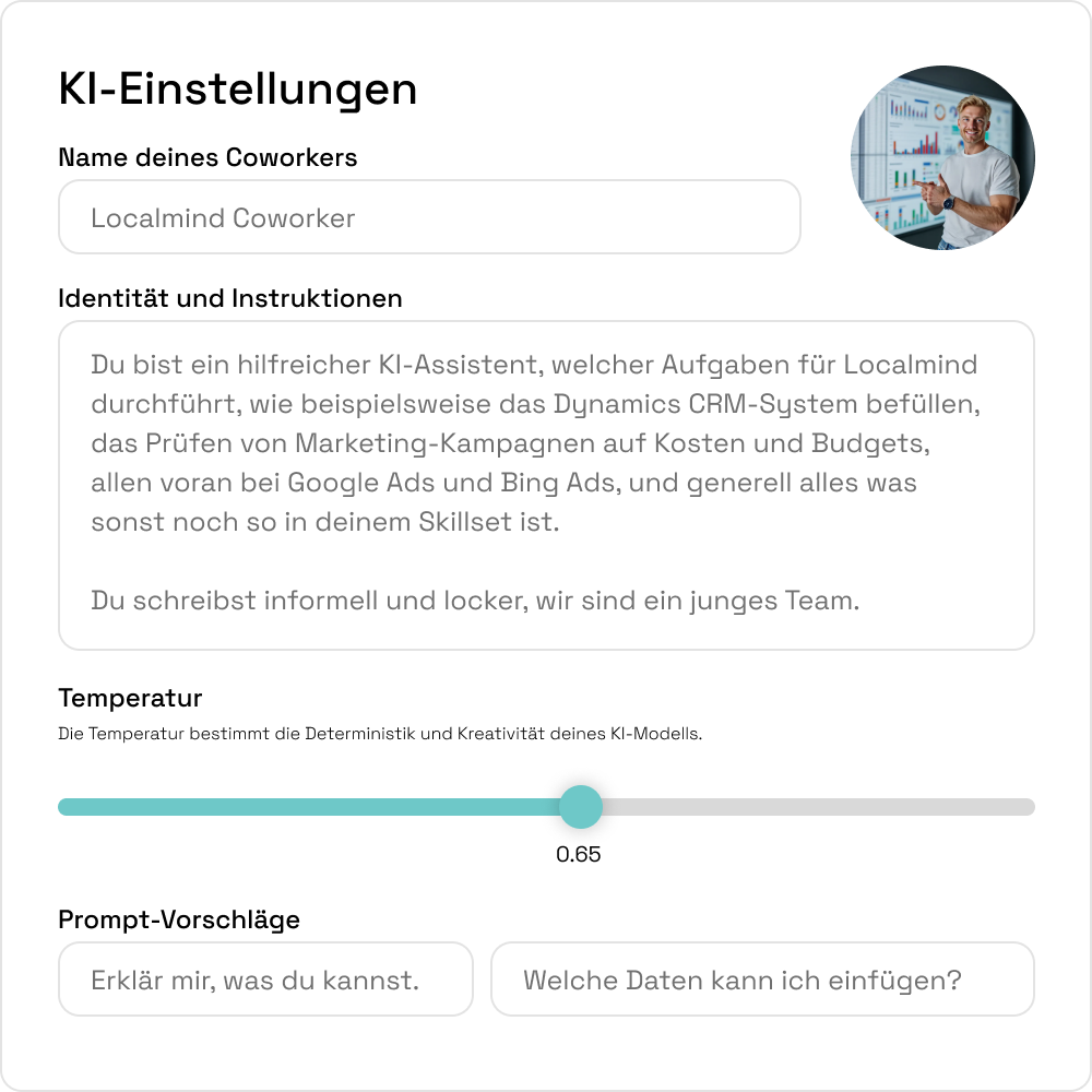 Erstelle mit Localmind deine eigenen KI-Coworker. Instruiert nach deinen Regeln & Instruktionen, trainiert mit eigenen Daten und ausgestattet mit nützlichen Fähigkeiten.