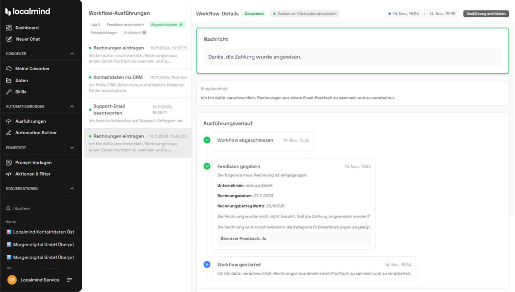 Überwache alle von der KI selbstständig ausgeführten Aufgaben und gib ihr Feedback in Echtzeit. Mensch und KI arbeiten bei Localmind stets gemeinsam und ergänzen sich gegenseitig.