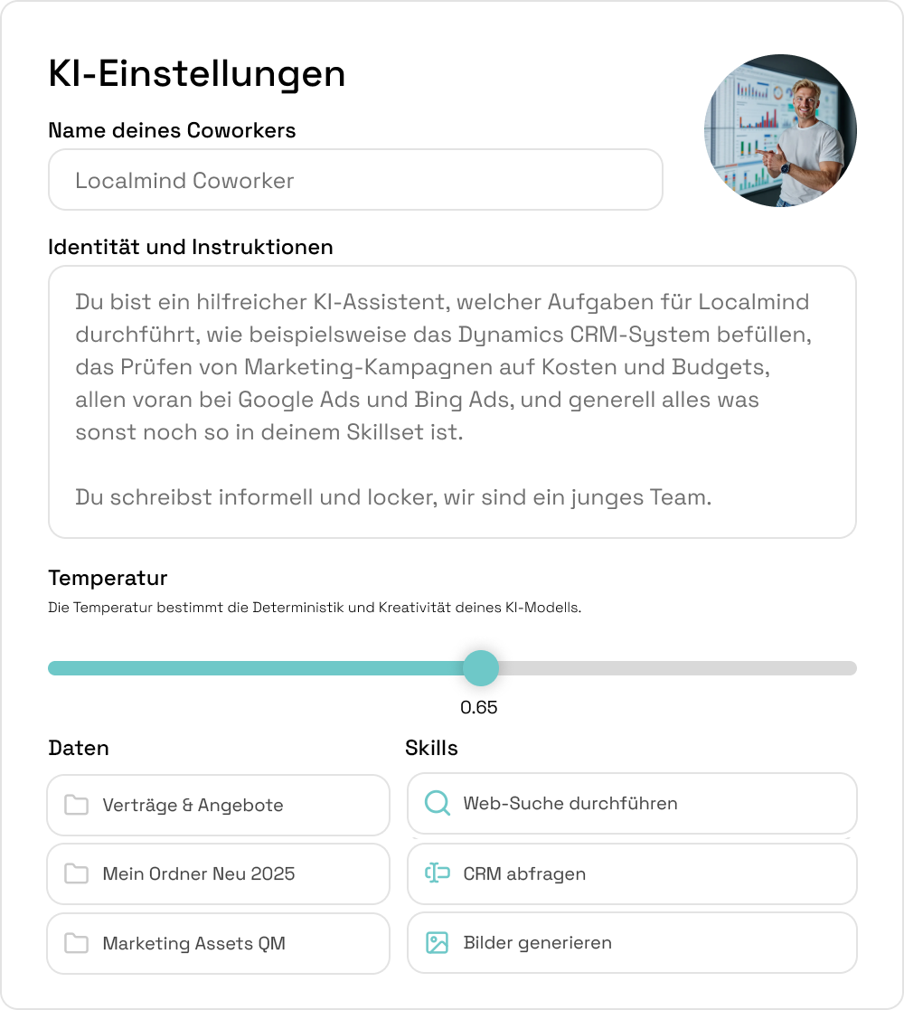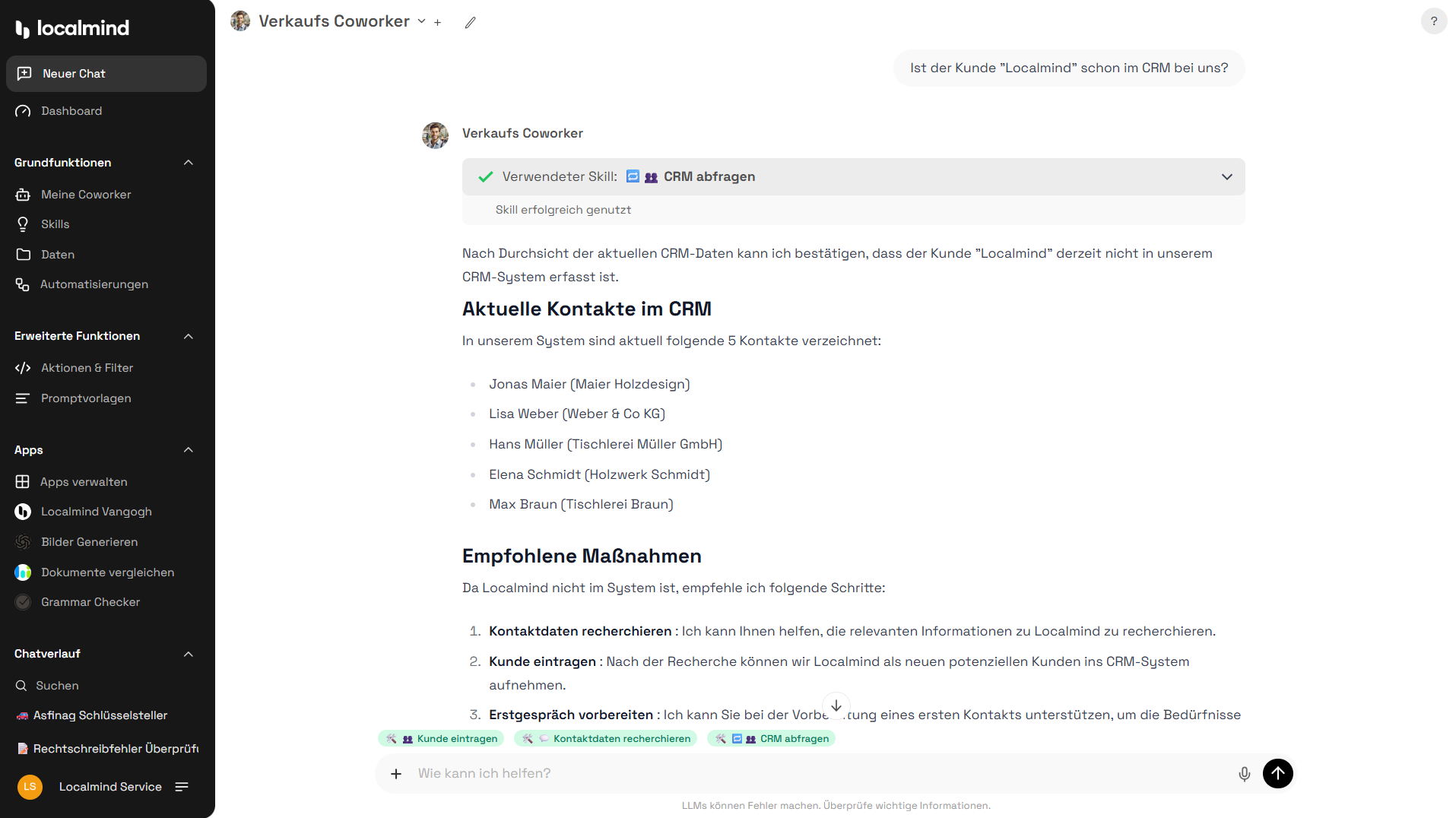 Erstelle mit Localmind deine eigenen KI-Coworker. Instruiert nach deinen Regeln & Instruktionen, trainiert mit eigenen Daten und ausgestattet mit nützlichen Fähigkeiten.