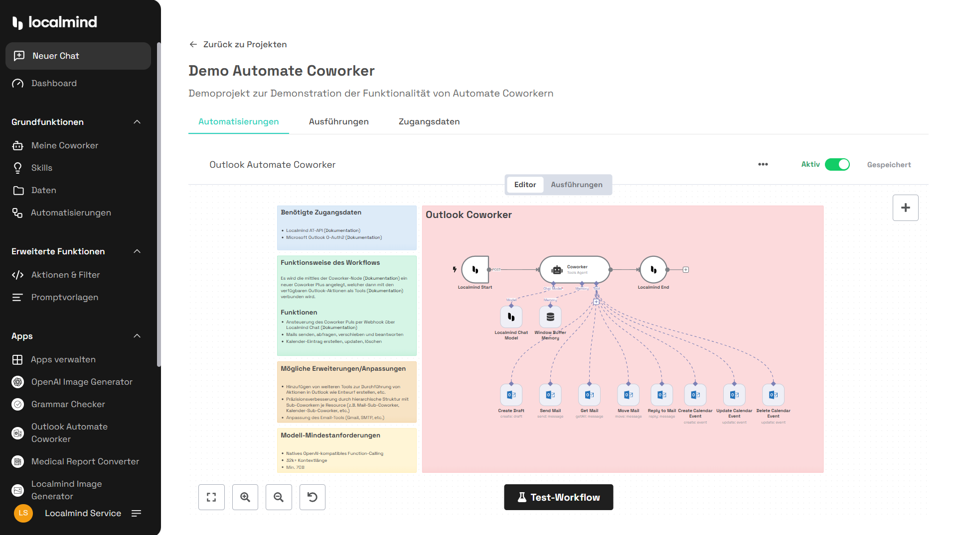 Binde deine Localmind KI-Coworker direkt in deine Workflows ein. Weise ihnen Aufgaben zu, lass sie Entscheidungen treffen, Daten analysieren oder mit anderen Systemen interagieren. Deine Agenten werden zu aktiven Teilnehmern deiner Prozesse.